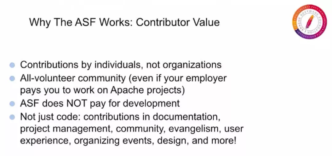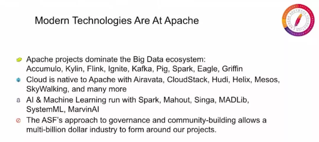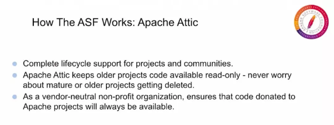 上面这张图所表述的是 Apache 带来的另一个关键价值,也许许多人都是想不到的,那就是对开源的完整生命周期支持。我们不仅积极指导新项目和支持现有项目,还确保休眠项目仍然可用,有很多软件项目我们都还在使用。即使它们没有经过积极开发,在 Apache 您可以放心,在 ASF 发布的所有软件都将永久免费可用,并且可以用于任何目的。