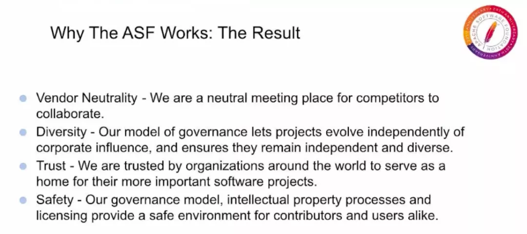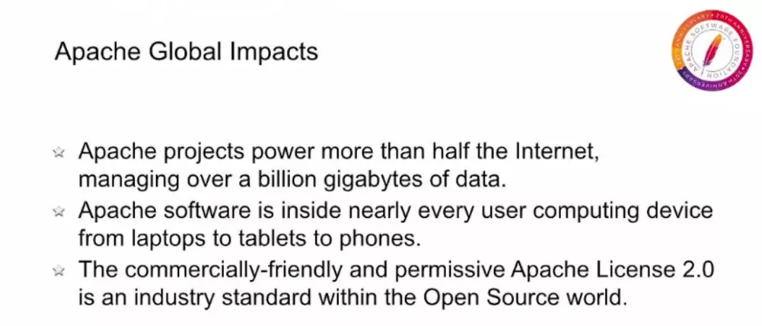 自 1999 年成立以来,Apache 已经发展成为开源领域最大、最重要的团队之一,到处都在使用 Apache 软件。管理社区主导项目以获得长期成功的 Apache Way,得到了许多其他开源团队和项目的仿效,现在多数开源基金会都仿效了许多 ASF 开创的协作技术。