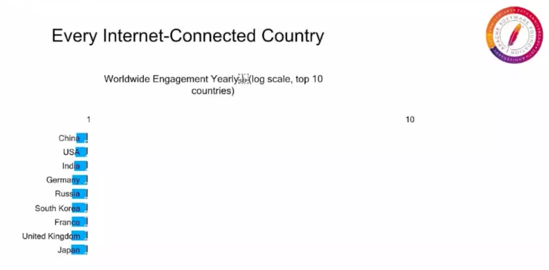谁下载了 Apache 软件?谁为 Apache 做了贡献?从上图我们可以看到过去一年中,直接下载或参与 Apache 项目的主要国家,中国位居榜首。每个连接互联网的国家都有直接下载 Apache 软件产品或为我们的项目做出过贡献的用户。在此之中,来自中国的新社区和贡献者,加入 Apache 项目的速度尤其惊人,我们非常欢迎其帮助我们进行创新。