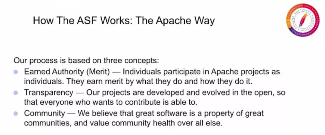 我们来谈谈 Apache 是如何工作的,我们如何与世界各地的贡献者一起管理所有这些项目。我们把这种方法称为「Apache Way」,它依赖于像你们这样的志愿者,我们关注以下三点来保持项目治理健康发展获得的权威,这表明负责项目的人,就是实际工作的人,ASF 没有自上而下的领导,每个 Apache 项目都会设定自己的方向,而开发技术的人决定项目方向。所有项目决策都是透明的,在公开和公共存档的邮件列表中列明,重要的是决策须在一段时间(至少 72 小时)内做出。