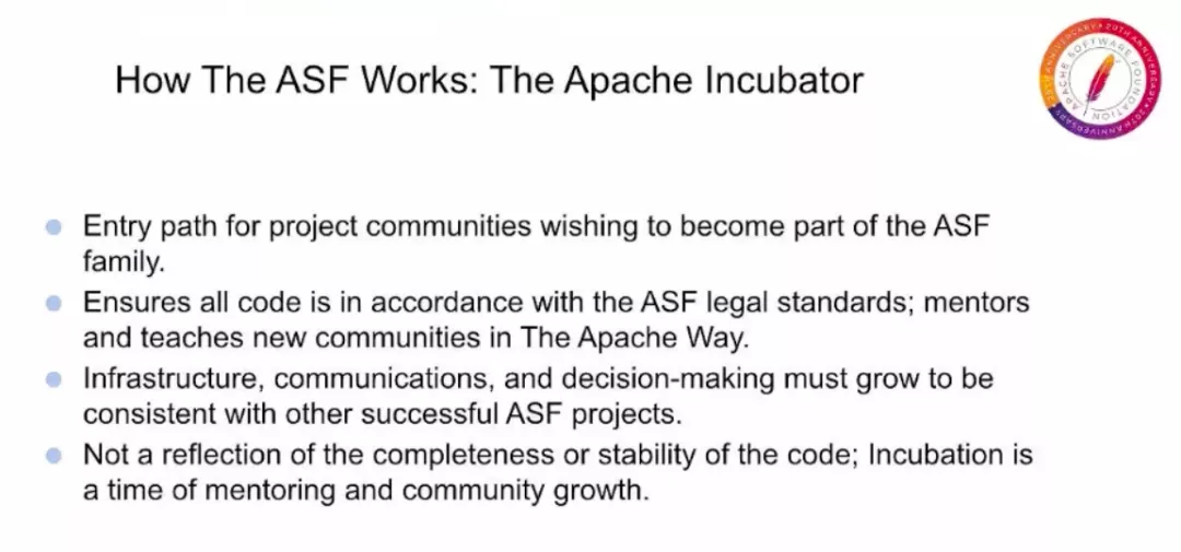那么,我们如何建立强大的社区?我们有 Apache 孵化器来指导新项目,所有希望加入 ASF 的新项目都会首先进入孵化器并成为一个项目。