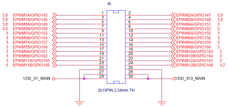 注意:实验时必须连接EPWM31/GPIO145和EPWM3A/GPIO149引脚,即用杜邦线连接J6-PIN1与J6-PIN5。使用示波器观察ePWM3A输出的波形时,也必须保持J6-PIN1与J6-PIN5的连接。