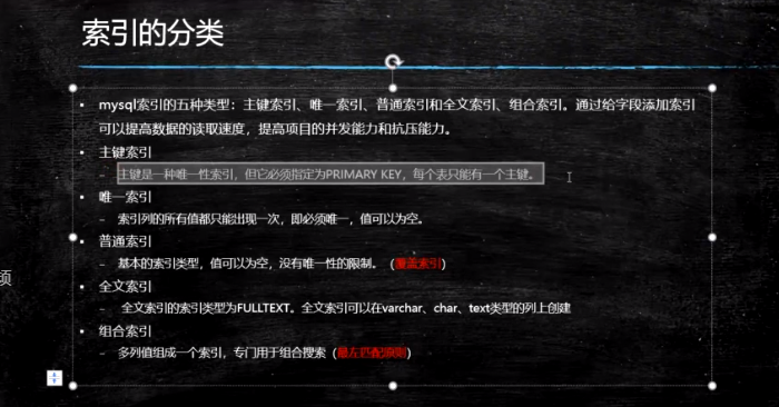 主键索引、唯一键索引、普通索引、全文索引、组合索引。