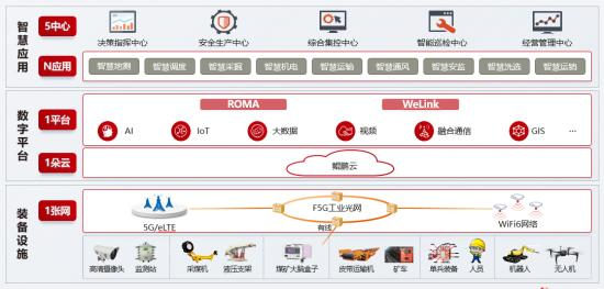 往下,是矿山纷繁复杂的设备、传感器和人员装备;往上,是合作伙伴提供的各种应用(“N应用”,提炼出5中心);中间,是华为充分了解需求基础上布设的“一张网、一朵云、一平台”。