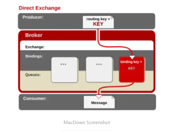 消息中的路由键(routing key)如果和Binding中的binding key一致,交换器就将消息发到对应的队列中。路由键与队列名完全匹配。