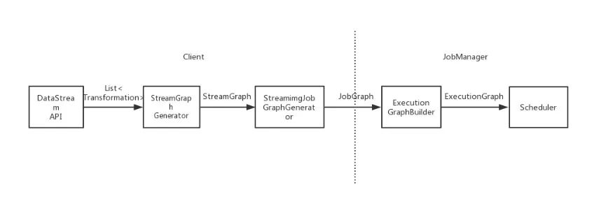 当 env.execute() 被调用时,在 client 端 StreamGraphGenerator 首先会遍历 Transformation 列表构造出 StreamGraph 对象(每个 Operator 对应一个 StreamNode),然后 StreamingJobGraphGenerator 再将 StreamGraph 翻译成 DataStream/DataSet/Table/SQL 通用的 JobGraph(此时会应用 chaining policy 将可以合并的 Operator 合并为 OperatorChain,每个 OperatorChain 或不能合并的 Operator 对应一个 JobVertex),并将其传给 JobManager。