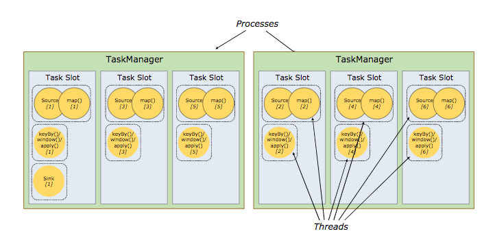 在线程级别,TaskManager 会将其资源均分为若干个 slot (在 YARN/Mesos/K8s 环境通常是每个 TaskManager 只包含 1 个 slot),没有 slot sharing 的情况下每个 slot 可以运行一个 SubTask 线程。除了 Managed Memory,属于同一 TaskManager 的 slot 之间基本是没有资源隔离的,包括 Heap Memory、Network Buffer、Cutoff Memory 都是共享的。所以目前 slot 主要的用处是限制一个 TaskManager 的 SubTask 数。