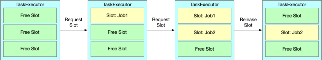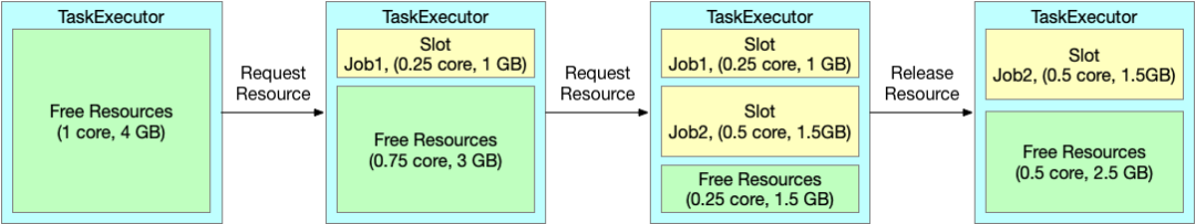 FLIP-56[5] 提议通过将 TaskManager 的资源改为动态申请来解决这个问题。TaskManager 启动的时候只需要确定资源池大小,然后在有具体的 Flink Job 申请资源时再按需动态分配 slot。Flink Job 申请 slot 时需要附上资源需求,TaskManager 会根据该需求来确定 slot 资源。