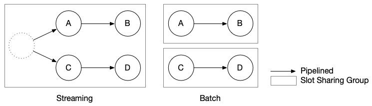 解决的方案是将 slot sharing 的机制拓展至 Batch 作业。默认情况下 Stream 作业的所有 Operator 都属于 default sharing group,所以全部 Operator 都能共用都一个 slot。对于 Batch 作业而言,我们将整个 JobGraph 根据 suffle 划分为一至多个 Region,每个 Region 属于独立的 sharing group,因而不会被放到同一个 slot 里面。