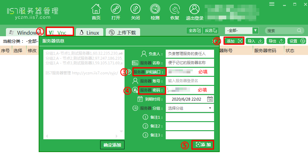 第三步:在弹出服务器信息框中填写Vnc信息,注意:IP 、密码为必填项,填写完毕后点击添加按钮;