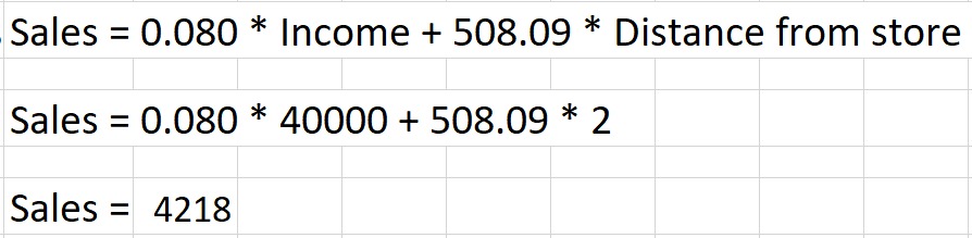 对于Winden鞋业公司来说,似乎每增加一个单位的收入,销售额就增加0.08,而增加一个单位的店面距离就增加508个销售额!