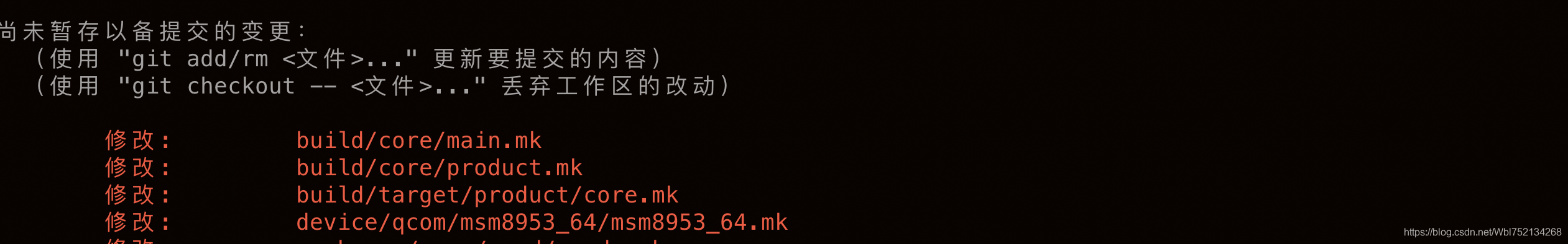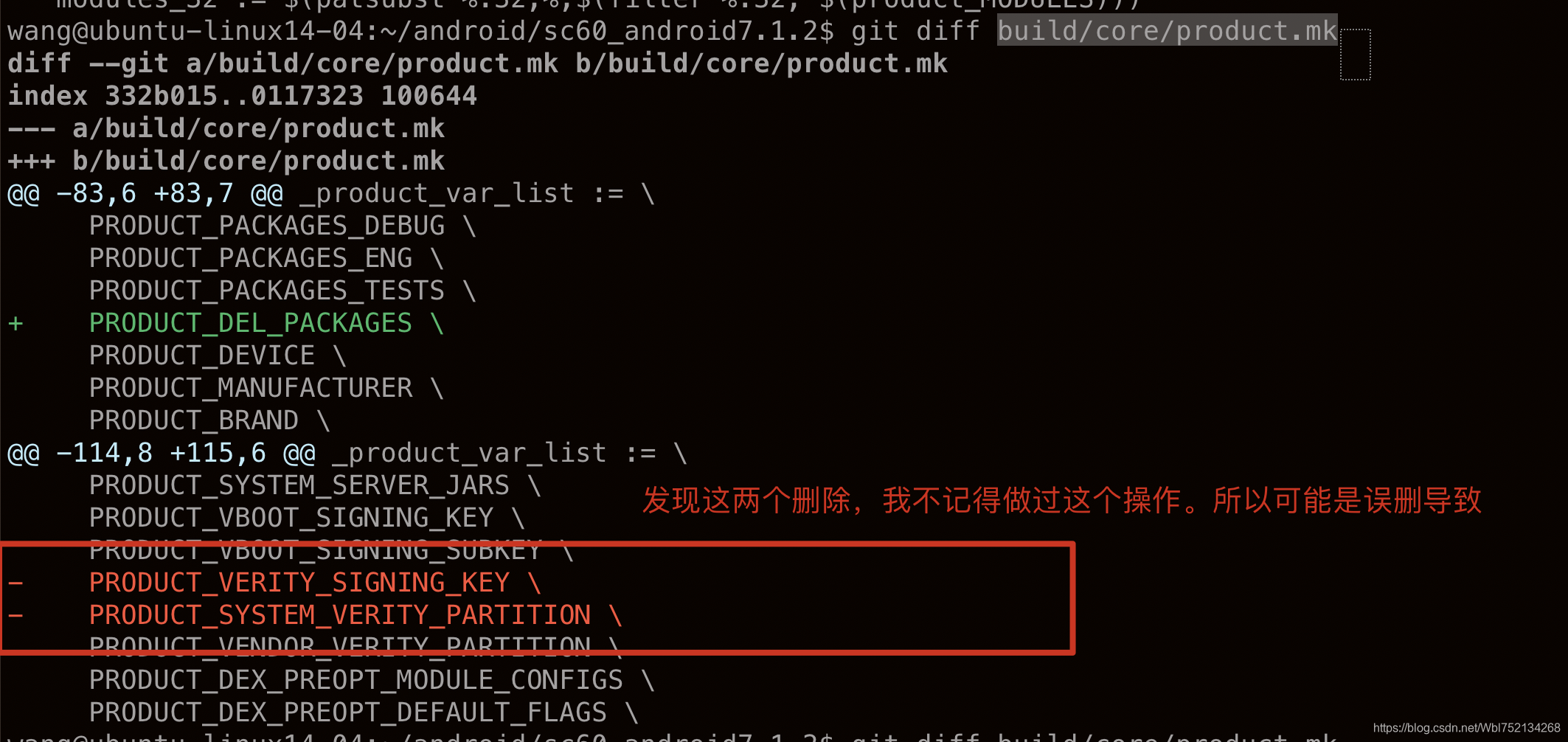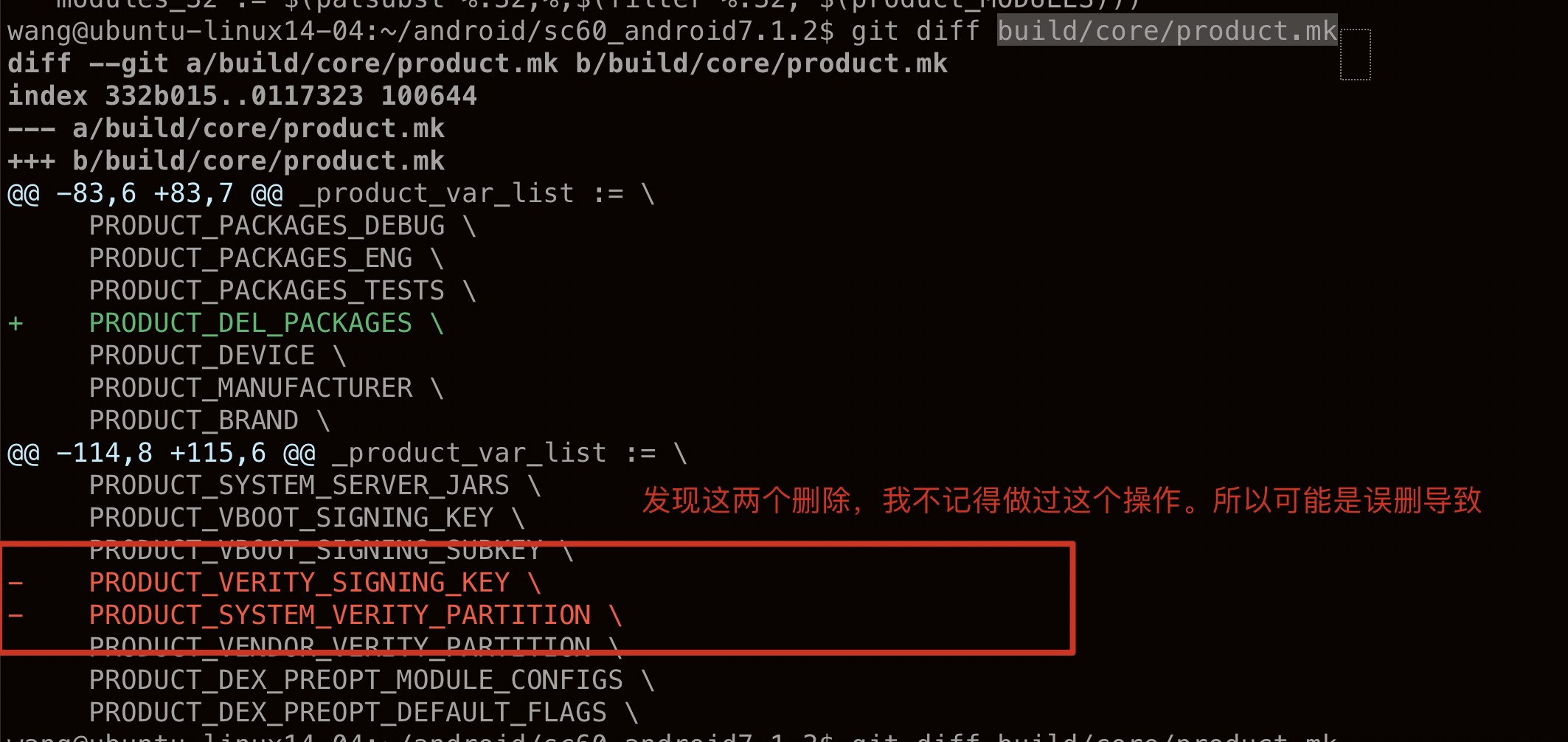 3、最终排查下来是build/core/product.mk这个文件中误删了上面红框内容,然后使用git checkout -- build/core/product.mk 来丢弃工作区的修改。