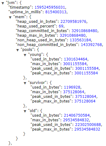 实际使用过程中,发现ES内存使用量往往到达一定百分比后(通常比75%高一点),才开始下降,之后内存上升到这个值后,又下降,呈现一种波浪状态,内存检测API如下所示:
