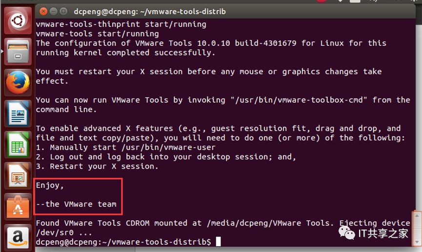 16、网速稳定的话,VMware增强工具安装过程大概3分钟左右,最后会有一个enjoy的提示,如下图所示,表示安装成功。