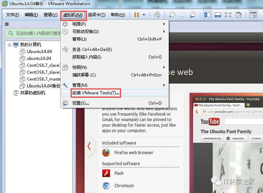 2、除了上述方法之外,也可以在Ubuntu虚拟机处于关机状态的时候,点击VMwareWorkstation中的“虚拟机”选项卡,然后选中“安装VMwareTools(T)”如下图所示,尔后再点击“开启虚拟机”,进入Ubuntu系统。