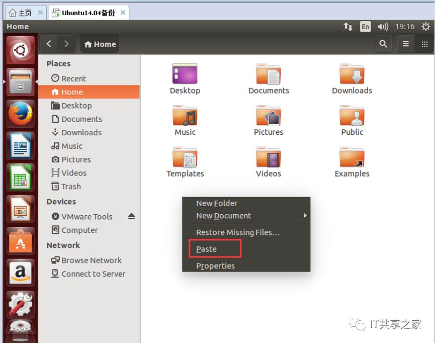 6、然后进入到Ubuntu系统的home目录下,如下图所示,然后右键,选择“粘贴(paste)”,将VMware增强工具安装包复制到home目录下。