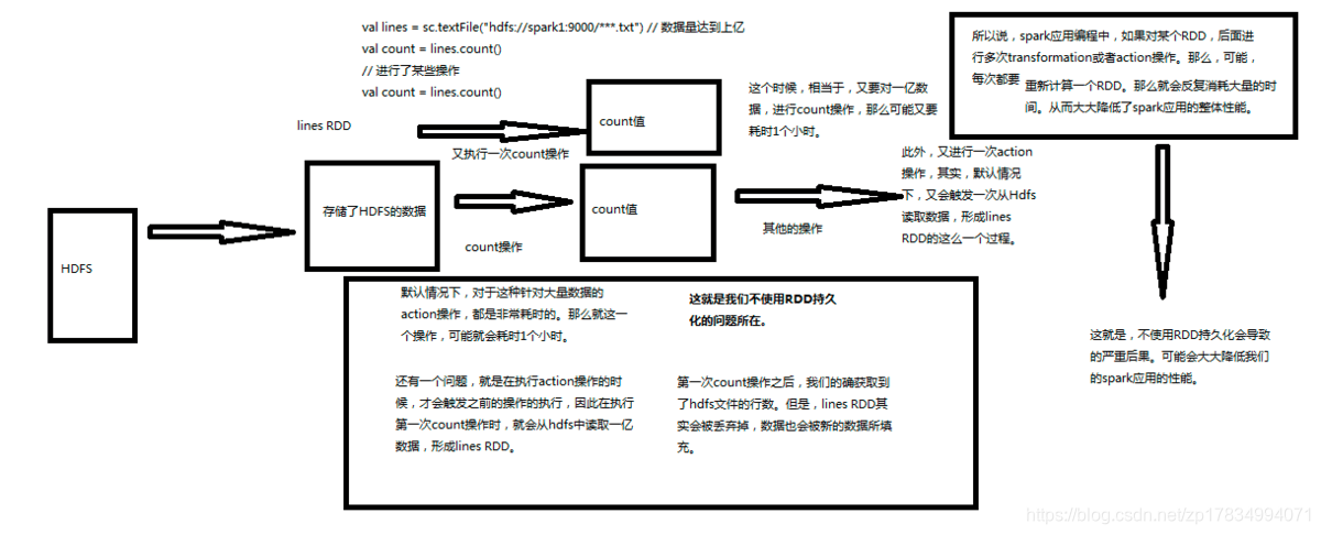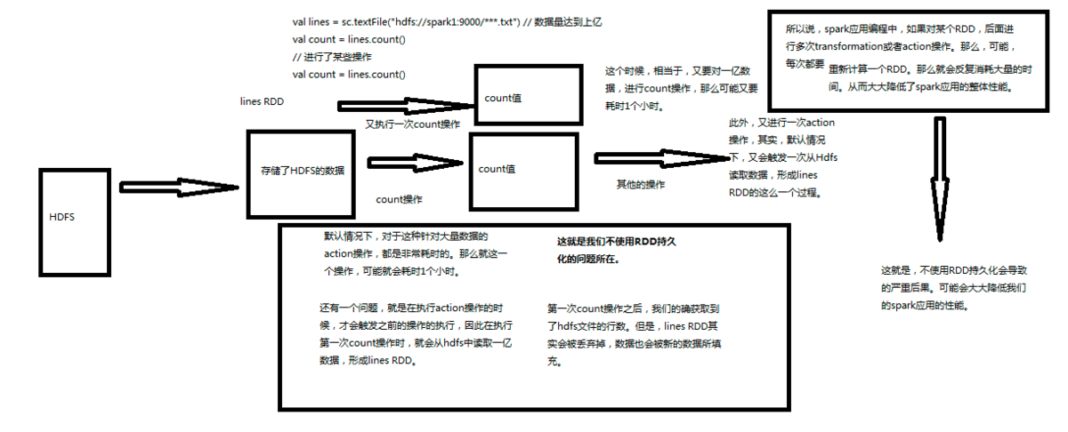 假设对这份文件做聚合操作之后我们又进行了某些操作,后面又需要对lines进行操作,看一下如果不使用RDD持久化会带来哪些问题.