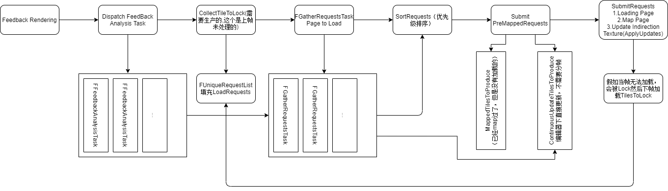 可以看到,FeedBackAnalysisTask和GatherRequestsTask是多线程做的。虽然是多线程,这边是同步等待执行的,因为后面的执行依赖前面的结果。在这些流程中,SubmitRequests这个流程会比较复杂,我从中再抽取出与Physical Texture加载相关的流程,Steaming Virtual Texture的加载过程: