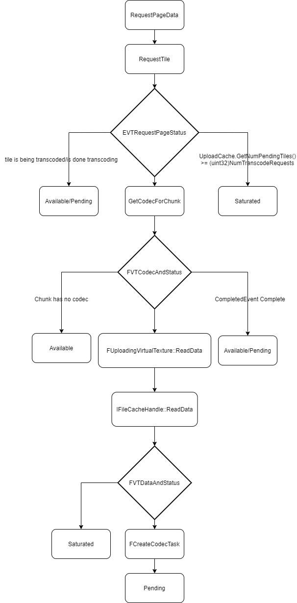 这个负责对Physical Texture Tiles的制造,一个FVirtualTexturePhysicalSpace对应一个FVirtualTextureProducer,主要的逻辑在IVirtualTexture的接口中,包括两个流程,一个是RequestPageData,这个流程主要是负责Tiles的加载过程。一个是ProducePageData,这个流程主要负责更新需要最终拷贝到Physical Texture的Tiles的列表。