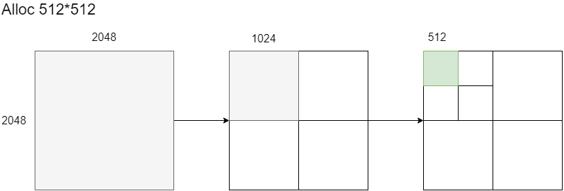 首先,先将Virtual Texture的大小Ceil到二次幂的正方形大小,然后在Allocator中申请。假如大小不够了,会调用Grow方法,在小于阈值的情况下增倍总大小;如果够,会尝试逐渐分割大小,直到大小合适,下面是一个比较简单的例子: