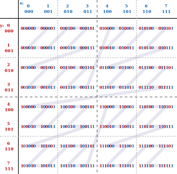 用上面的图编码(实际是U32的),如果要找到与vAddress为000001,Mip为1的子Tiles。首先对vAddress操作一下,000001 << (vDimensions * Mip) = 000100。这里vDimensions这里我们默认为2,因为Unreal是支持体纹理的,所以有可能为3。然后再计算一个Mask,~0u << (vDimensions * vLogSize) = 00100,就可以发现使用Mask对左上第二个Quad操作,地址就等于vAddress了,这样就找到了它的所有子Tile。