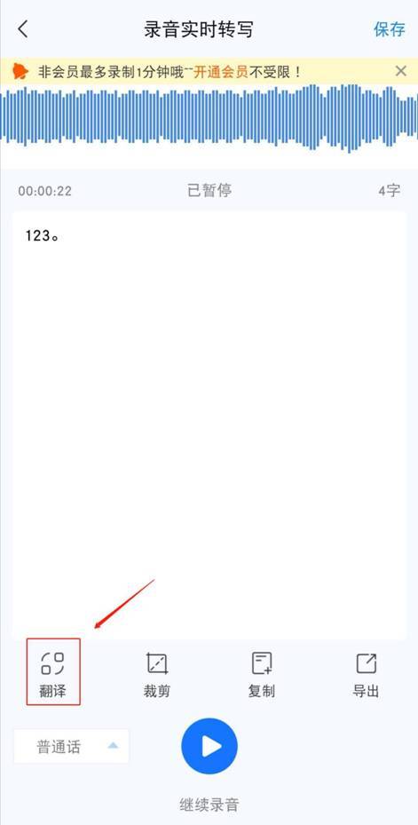 点击页面下方的【开始录音】蓝色按钮,文字会根据录音的内容自动转换。录音完成后,再点击一次来结束录音。(点击【翻译】,可以把中文翻译成英文。)