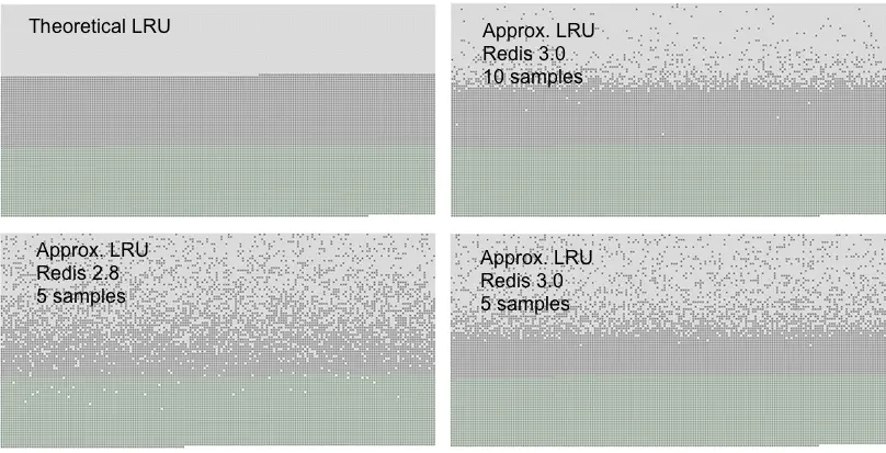 左上-理论LRU效果;右上-Redis3.0中的近似LRU(采样值10);左下-Redis2.8中的近似LRU(采样值5);右下-Redis3.0中的近似LRU(采样值5)
