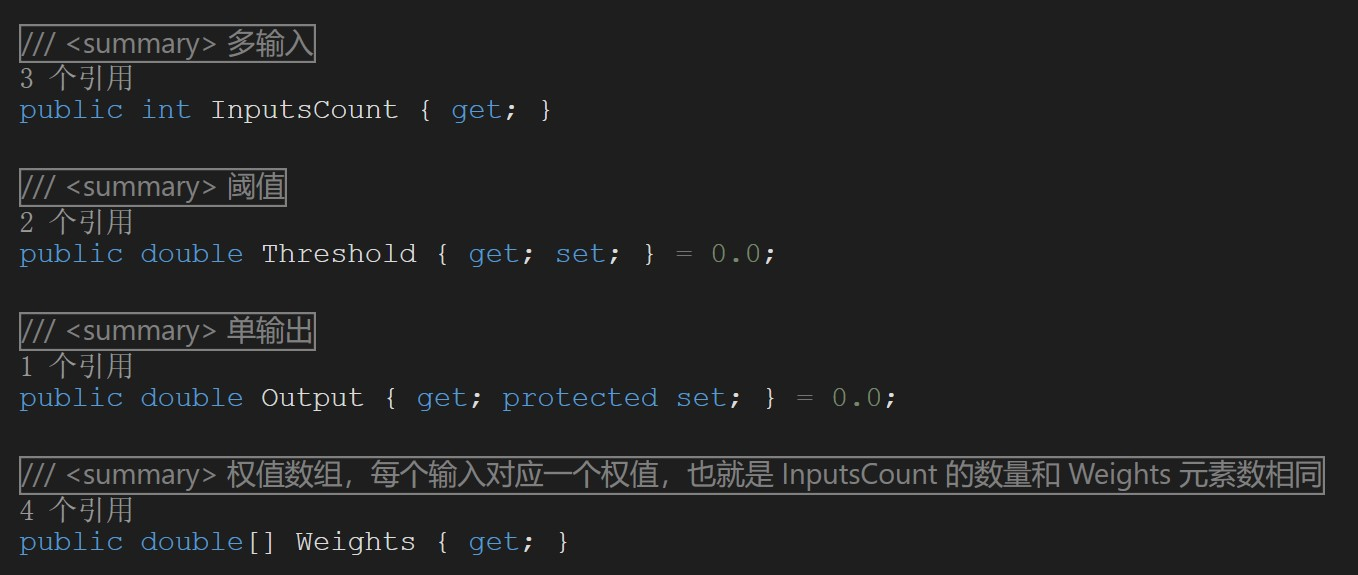 那么一个简单的神经元的属性就定义完成了,核心的属性只有两个,也就是权重数组和阀值。而输入个数和输出这两个属性只是为了调试方便,可以在调试时看到状态而已