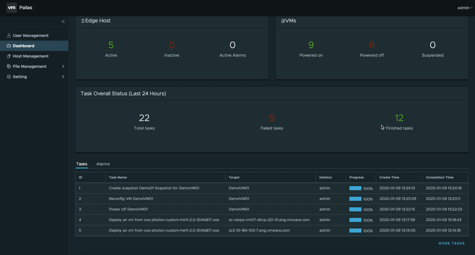 需要注意的是:因为管理器和设备之间元数据的传输协议是基于MQTT,所以设备和虚机等状态的更新是异步完成的。如果不能及时看到任务完成,可能需要稍候、或者刷新状态。