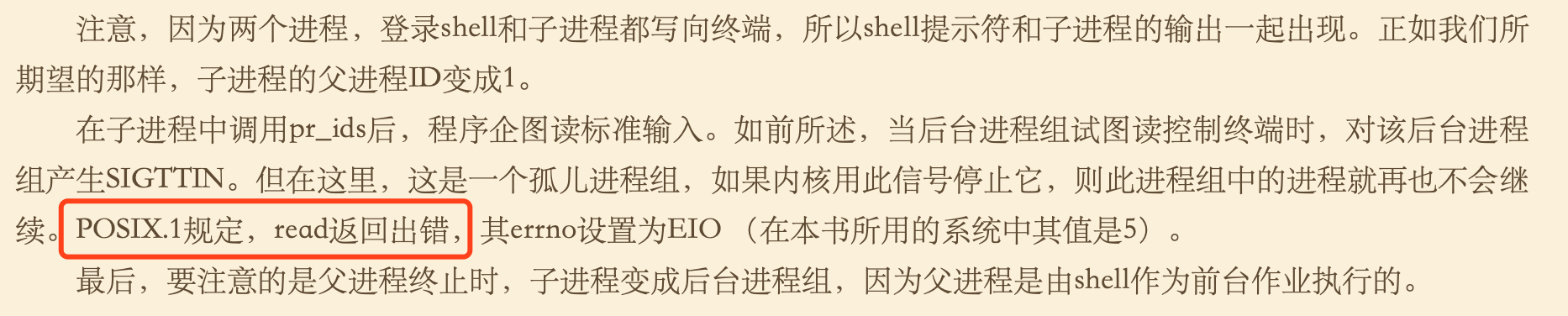 3. 子进程处理SIGHUP信号的时候,已经是孤儿进程组成员了,没有权限刷到标准输出,为什么成功打印了“SIGHUP received, pid = 15878”呢?同样的疑惑,为什么child能在终端打印“read error %d on controlling TTY\n”呢?关于这个疑问其实apue也有写,POSIX.1只对读控制终端作出限制。
