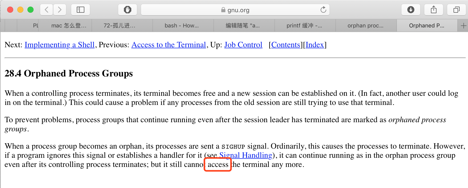孤儿进程组不可以获得终端,这是为了保证控制进程死掉后他的终端可以安全分配给新session。posix要求向新孤儿进程组中停止状态的进程(GNU说是给孤儿进程组里所有进程发消息,而APUE中文版说是给停止状态的进程发消息)发送SIGHUP(挂起)信号和SIGCONT(继续)信号。首先处理SIGHUP信号,系统默认处理是终止进程,然而也可以另行处理这样进程会继续执行,但任不可以再获得终端。