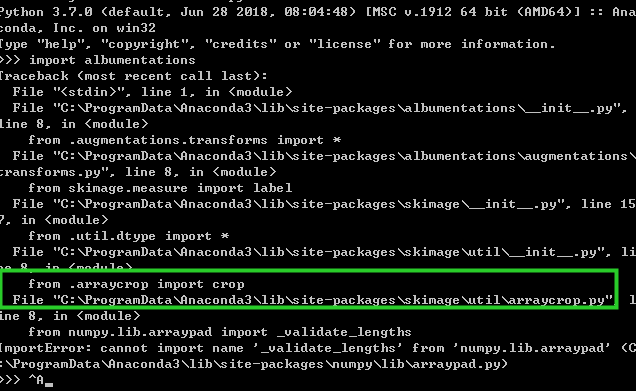 查看错误代码位置:C:\ProgramData\Anaconda3\Lib\site-packages\skimage\util\arraycrop.py文件