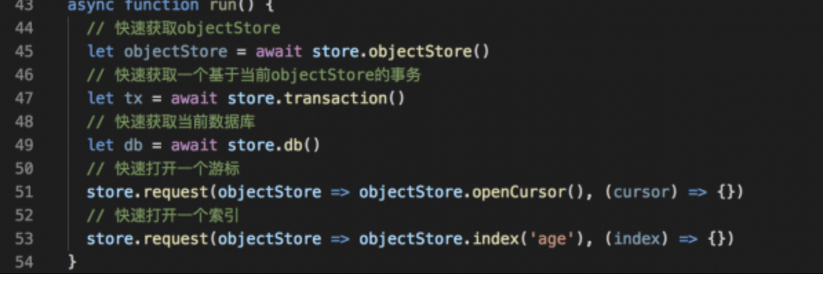 上图中的代码和localStorage看上去唯一的不同在于,indexedDB的所有操作都是异步的,因此被放在一个async函数中。除此之外,我们看不出使用indexedDB保存数据有任何难度。