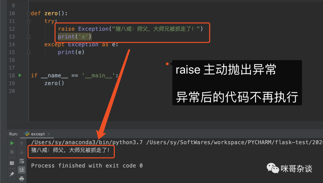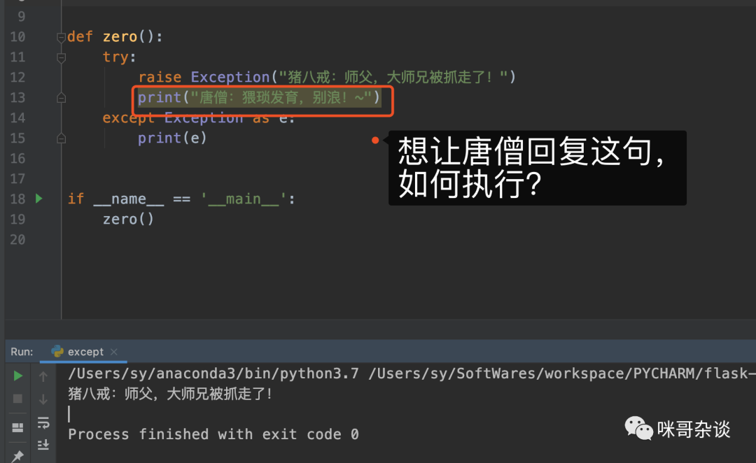 对应到程序中,代码开始运行的地方则是唐僧的出发点,结束的地方则是唐僧的取经地点。妖怪一旦出来打断,你就无法前行。异常一旦出现,你的代码就无法继续正常往下运行了。