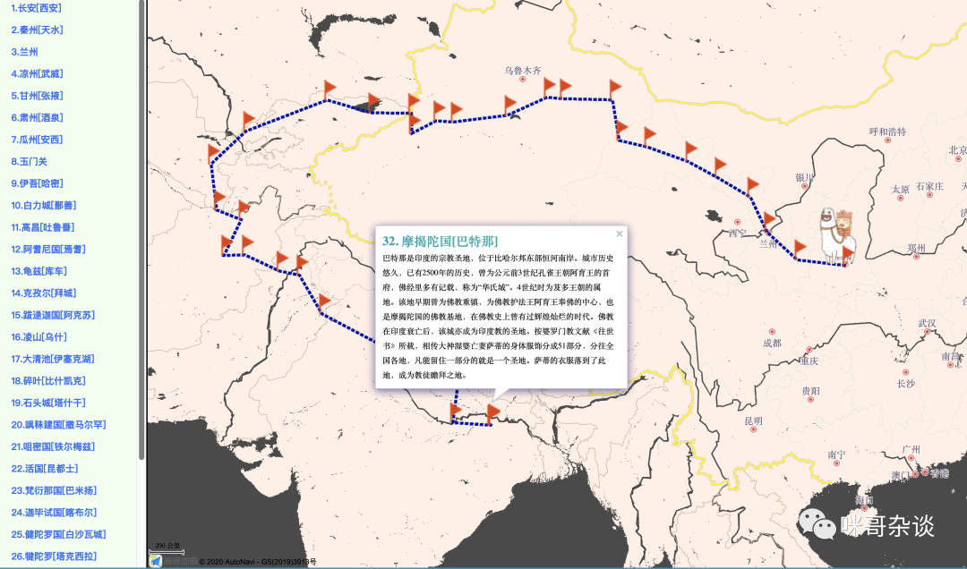 唐僧西天取经,从长安开始,到摩揭陀国结束。一路规划行程,每个红旗就是途径的地点。