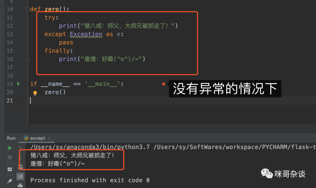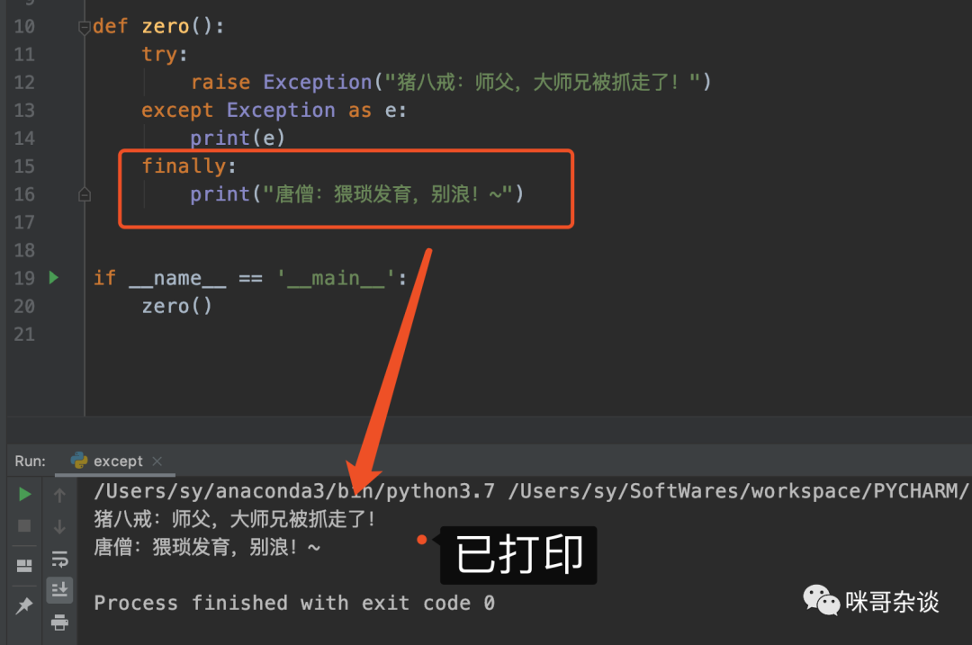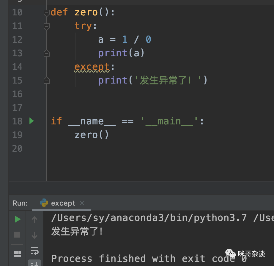 可以看到,异常被 except 代码块捕获了,并打印了发生异常。
