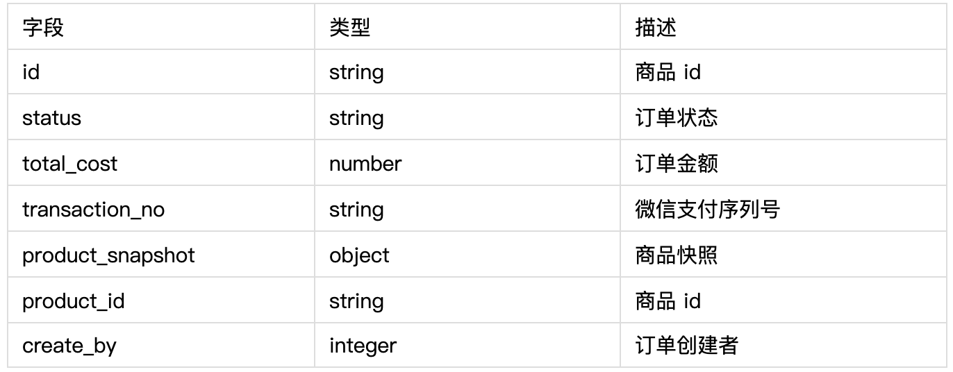 1) 创建订单:Order 表中创建一条新记录,status 字段默认值为 "no_paid",保存订单金额,商品快照和商品 id 以及订单创建者,其中订单创建者由 BaaS 的用户系统自动处理,值为创建订单的用户 id: