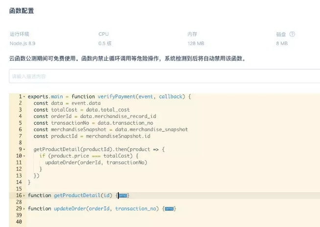 为了避免创建订单时客户端数据篡改或商品信息不能实时同步的问题,我们将创建订单的逻辑迁移到 BaaS 平台的云函数中:
