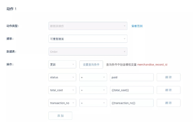「动作」定义了触发器将要执行的操作,这里是更新 Order 数据表对应的 status、total_cost 和 transaction_no 字段。更多触发器的具体细节,不同平台的实现有所不同,在此不展开讨论。