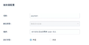 「触发类型」选择微信支付回调,条件是支付成功后执行触发器。一般触发器类型常见的还有操作数据表,定时任务等,分别对应操作数据表后触发和定时触发。