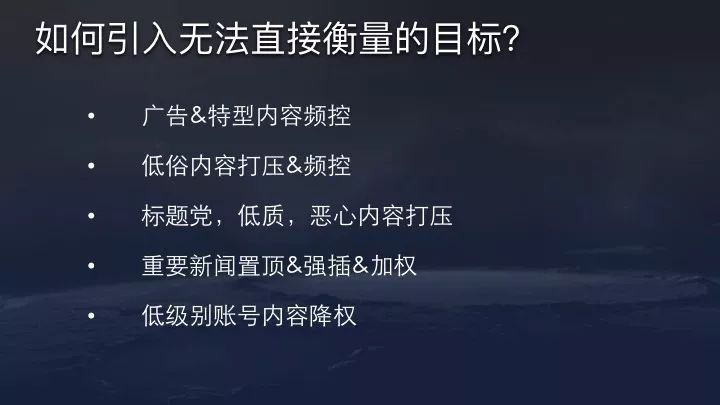 此外,平台出于内容生态和社会责任的考量,像低俗内容的打压,标题党、低质内容的打压,重要新闻的置顶、加权、强插,低级别账号内容降权都是算法本身无法完成,需要进一步对内容进行干预。
