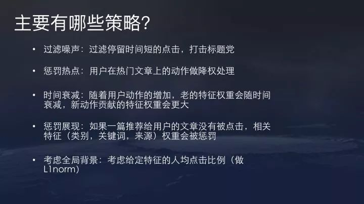 当然最简单的用户标签是浏览过的内容标签。但这里涉及到一些数据处理策略。主要包括:一、过滤噪声。通过停留时间短的点击,过滤标题党。二、热点惩罚。对用户在一些热门文章(如前段时间PG One的新闻)上的动作做降权处理。理论上,传播范围较大的内容,置信度会下降。三、时间衰减。用户兴趣会发生偏移,因此策略更偏向新的用户行为。因此,随着用户动作的增加,老的特征权重会随时间衰减,新动作贡献的特征权重会更大。四、惩罚展现。如果一篇推荐给用户的文章没有被点击,相关特征(类别,关键词,来源)权重会被惩罚。当然同时,也要考虑全局背景,是不是相关内容推送比较多,以及相关的关闭和dislike信号等。