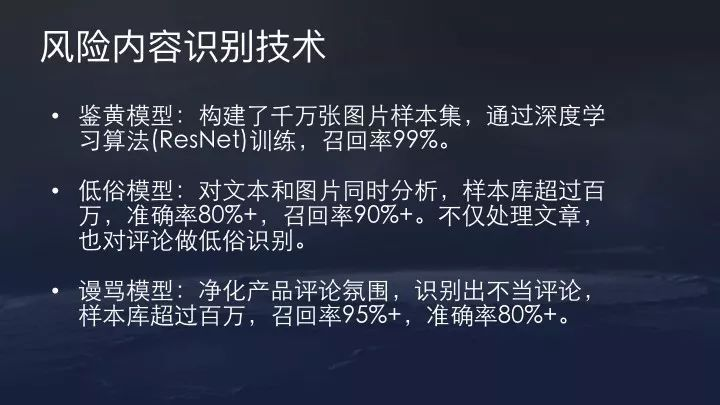 分享内容识别技术主要鉴黄模型,谩骂模型以及低俗模型。今日头条的低俗模型通过深度学习算法训练,样本库非常大,图片、文本同时分析。这部分模型更注重召回率,准确率甚至可以牺牲一些。谩骂模型的样本库同样超过百万,召回率高达95%+,准确率80%+。如果用户经常出言不讳或者不当的评论,我们有一些惩罚机制。