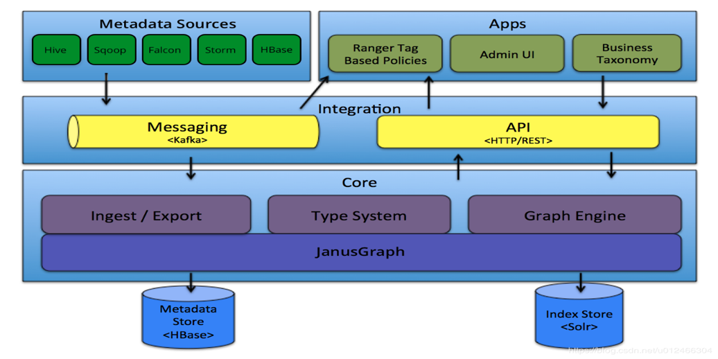 此图为Atlas的架构图,主要包含的组件如图所示,我们主要关注于在Core组件中使用JanusGraph图数据库来存储元数据对象。Atlas采用了分布式图数据库JanusGraph作为数据存储,目的在于用有向图灵活的存储、查询数据血缘关系。默认情况下元数据存储配置为 HBase ,索引存储配置为 Solr。也可以通过构建相应的配置文件使用BerkeleyDB存储元数据存储 和使用ElasticSearch存储 Index。元数据存储用于存储元数据对象本身,索引存储用于存储元数据属性的索引,其允许高效搜索。