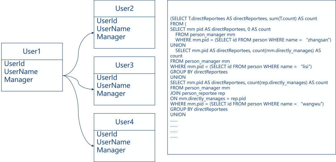 MATCH (boss)-[:MANAGES*0..3]->(sub), (sub)-[:MANAGES*1..3]->(userid)WHERE boss.name = “zhangsan”RETURN sub.name AS list, count(userid) AS Total