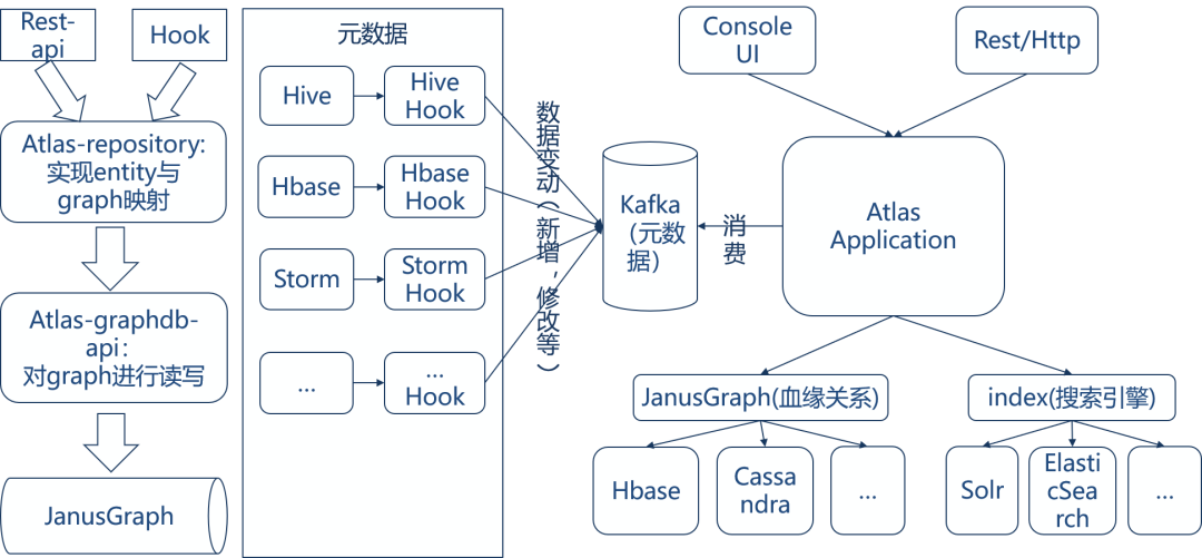 基于以JanusGraph图数据库为例,结合Atlas获取hadoop生态系统的元数据思路,未来数据资产可视化扩展对大数据的采集能力,以kafka作为消息系统,解耦生产者和消费者,图数据库作为数据处理核心,以Hbase、solr,es,zookeper等技术作为辅助手段。为数据存储,关系建立,数据血缘建立,数据快速查询提供便利。