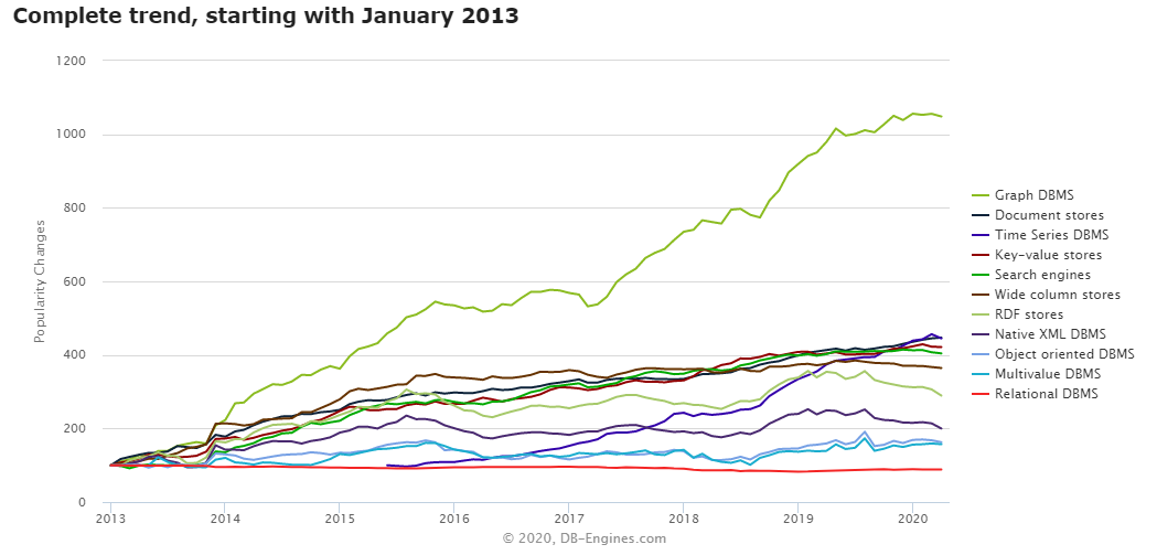 上图就是db-engines.com对从2013年来所有数据库种类发展趋势的分析结果如图展示。图(Graph)是非常强大的工具,因为它们通过以简洁的形式表示数据关系,帮助商业世界和其他机构中的人们理解数据集。有了合适的图数据库,企业可以以关系图的形式可视化数据,并对其进行管理,以提高整体效能。比起传统数据库的数据存储,图数据库能够清晰的展现点与点之间的关系。许多组织之所以接受图数据库,是因为越来越多的行业认识到这种数据库技术的重要性,尤其在复杂的场景下,如物流,金融风控,社交网络管理,媒体传播分析等行业正在发挥不可或缺的作用。