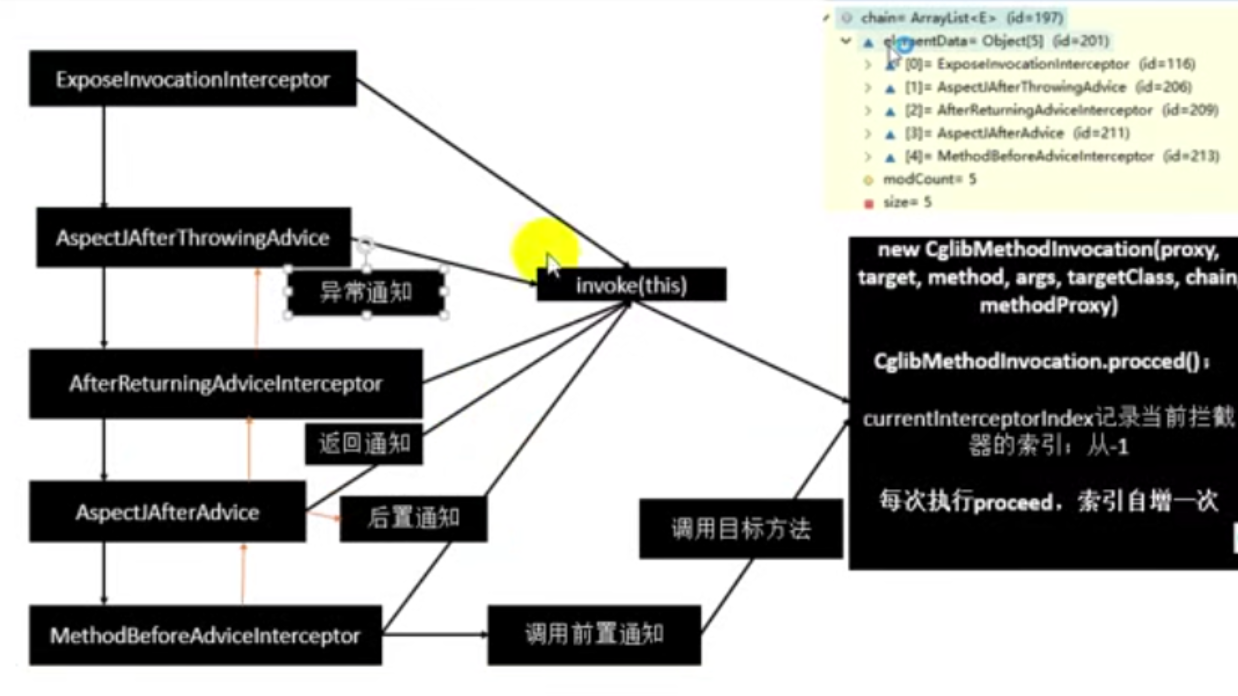 * 拦截器链的机制,保证通知方法与目标方法的执行顺序