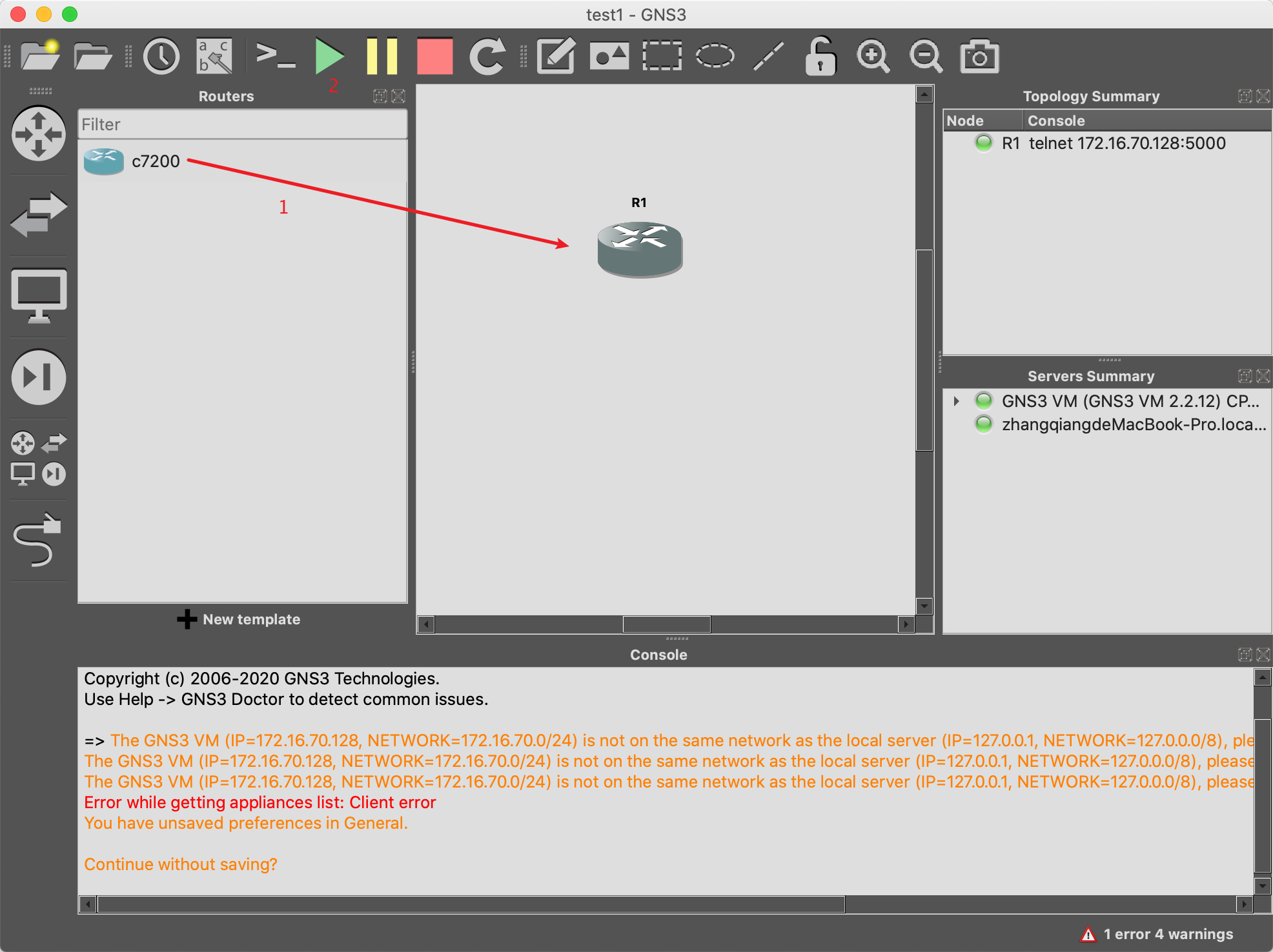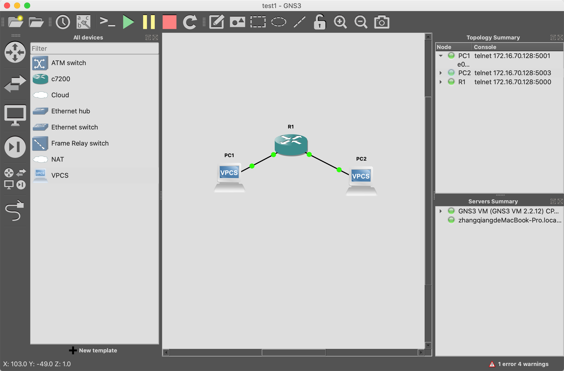 拖入2个vpcs,选择GNS3 Vm server。连线,启动