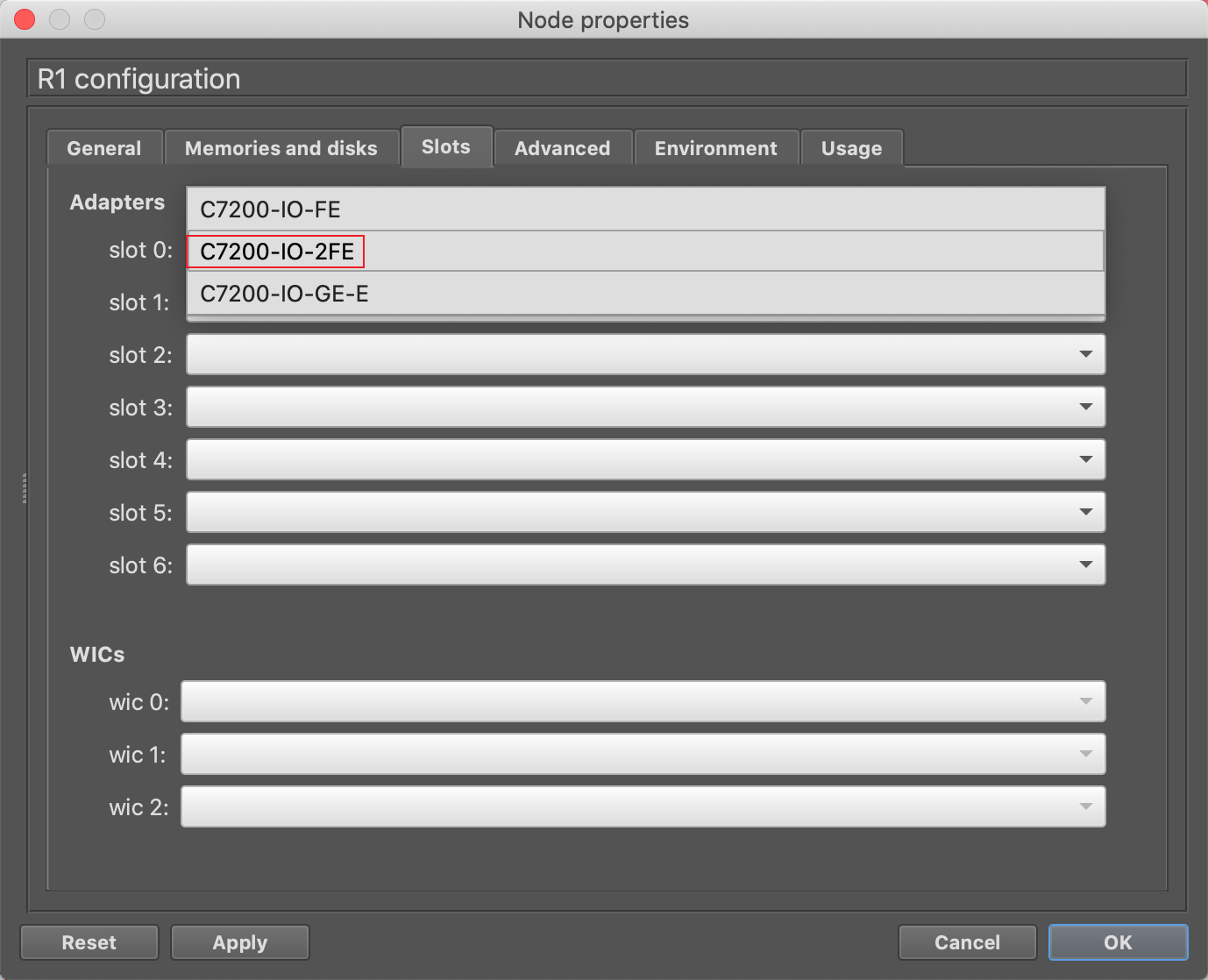 一路向下,到选择solts时选C7200-IO-2FE即2个千兆口,以防测试时口不够用,出现这个错误(Can't create the link the destination port is not free),也可后续修改模板。